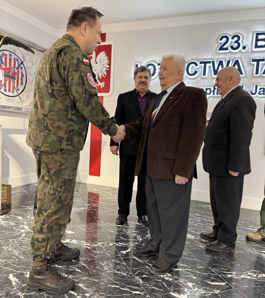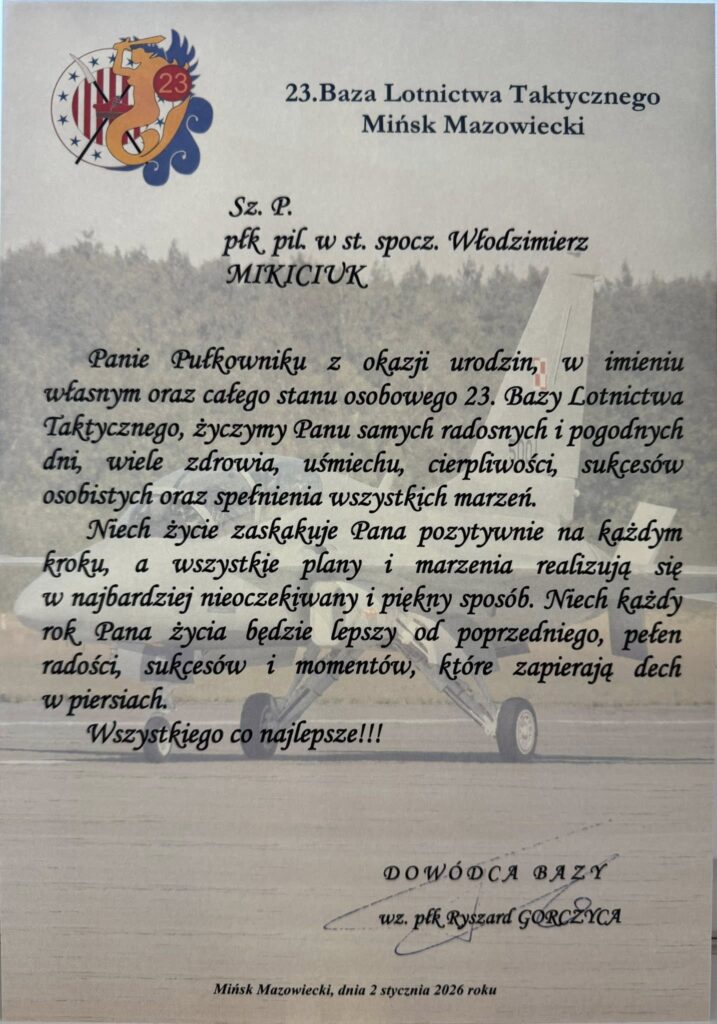 W dniu dzisiejszym mieliśmy niewątpliwy zaszczyt gościć wyjątkowego Jubilata Pana płk. pil. w st. spocz. Włodzimierza MIKICIUKA. Z okazji 92 urodzin Pana Pułkownika, w 23. Bazie Lotnictwa Taktycznego odbyło się spotkanie zorganizowane przez Zastępcę Dowódcy Bazy Pana płk. Ryszarda GORCZYCĘ oraz Prezesa Fundacji Spadkobierców Tradycji Dywizjonu 303 Pana mjr. rez. pil. Waldemara ŁUBOWSKIEGO.